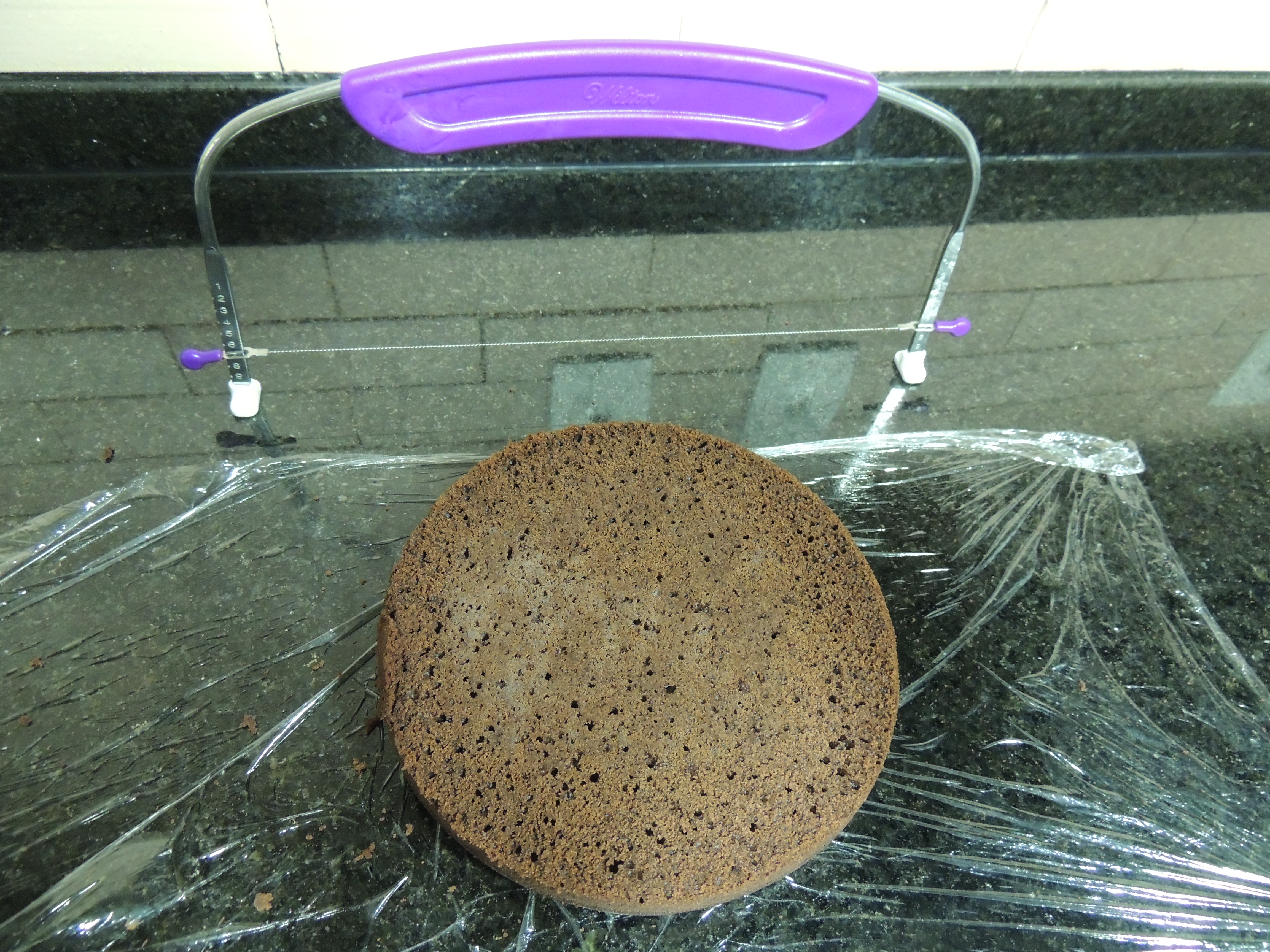 Level any lumps and divide the cakes horizontally. You can use a knife (a big one, preferably :)), a cake leveler or simply a piece of dental floss (put it around the cake, and pull both ends crossing one over the other).