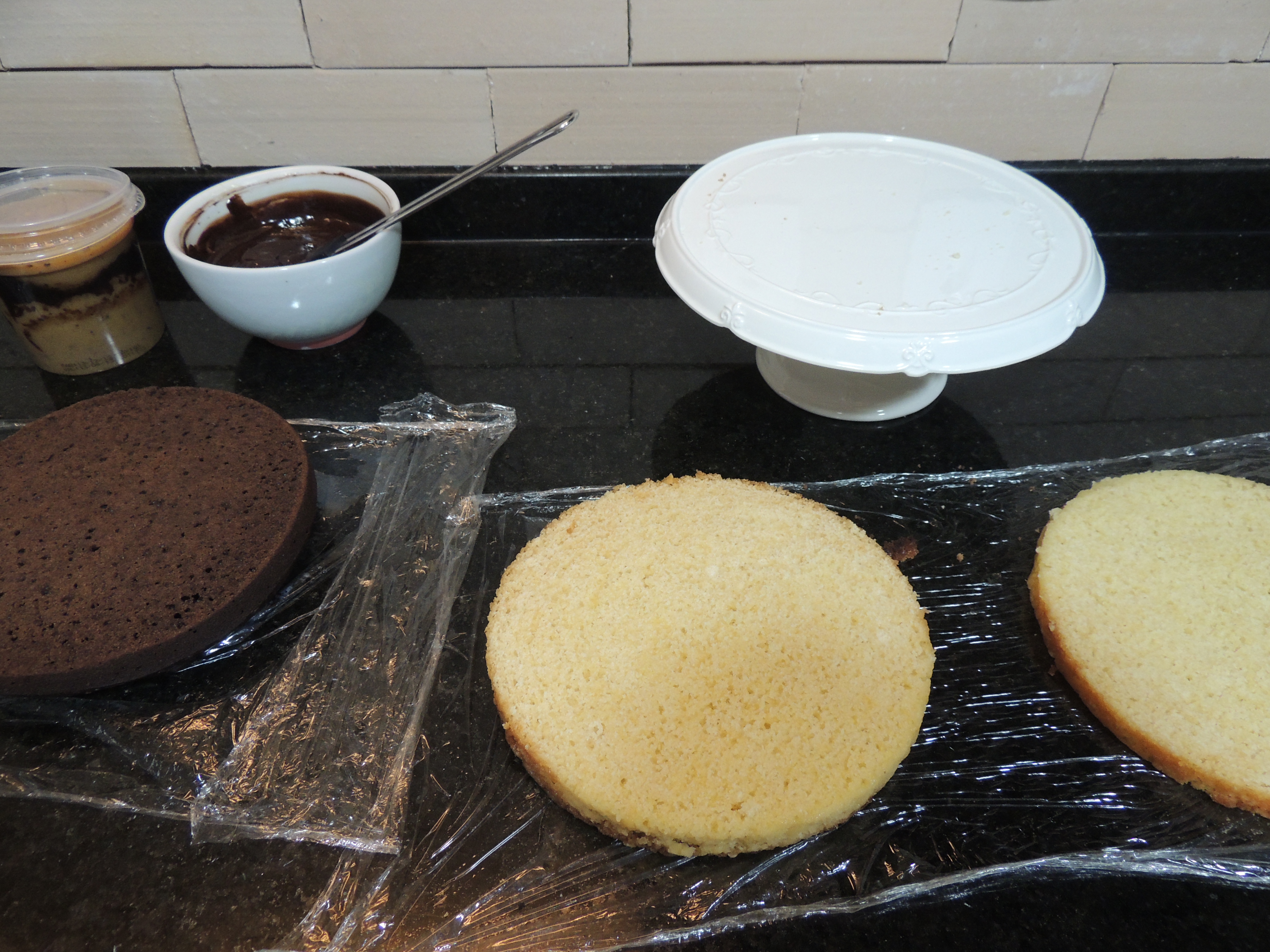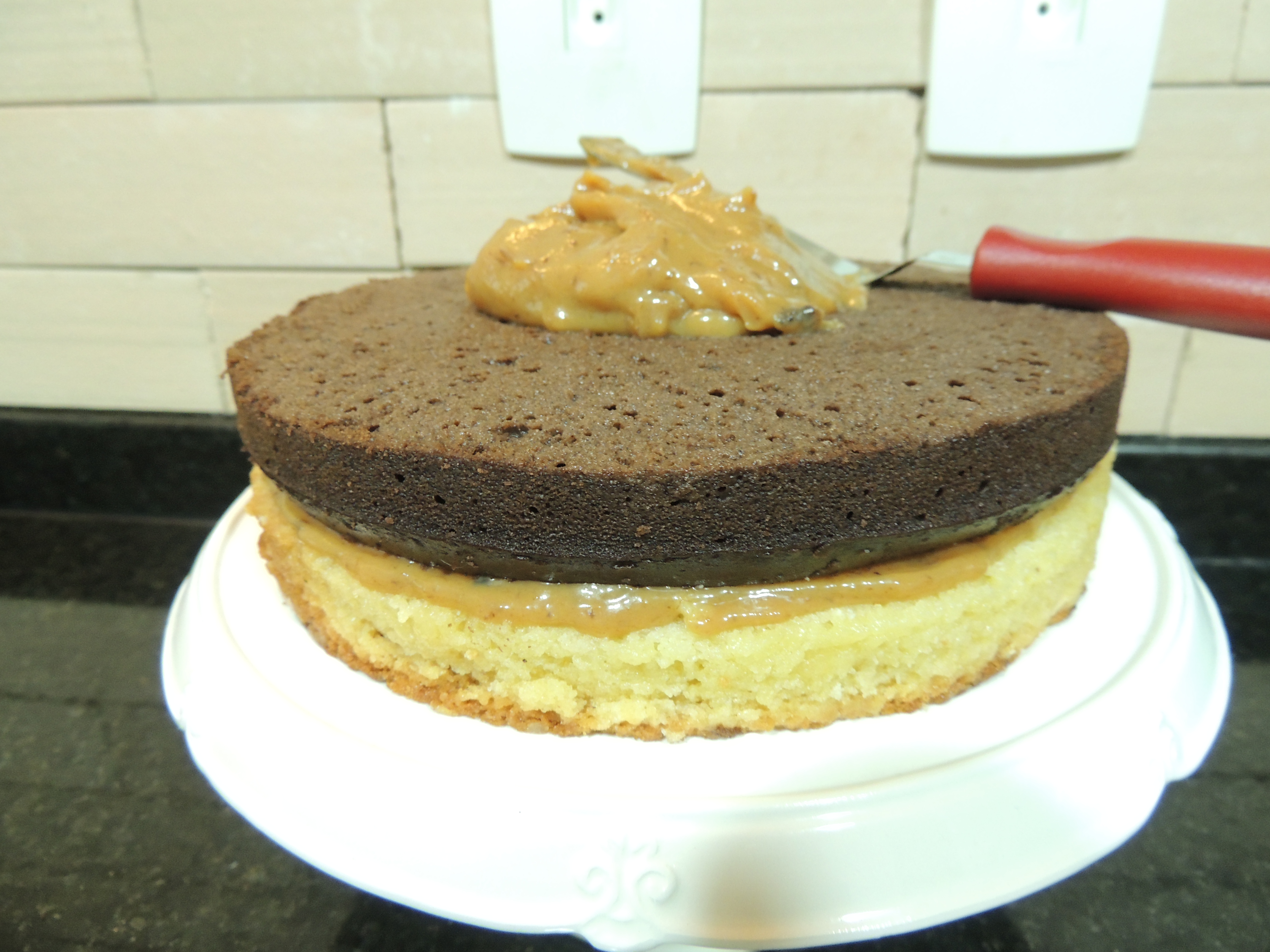 Put the first layer of cake on your cake stand and sprinkle it with milk. Spread the filling and cover it with the second layer. Repeat the process. Don’t forget to moisten the third layer!