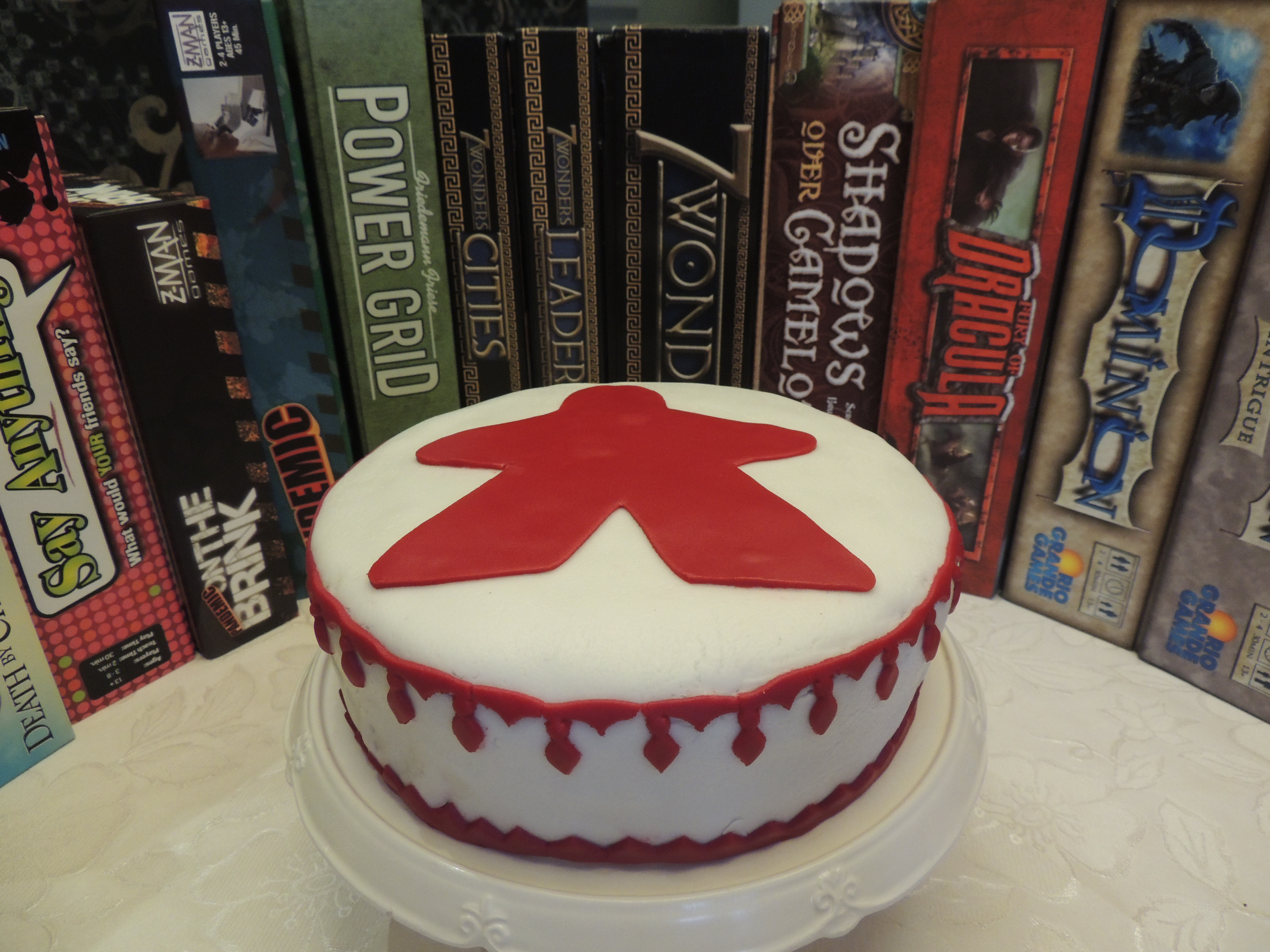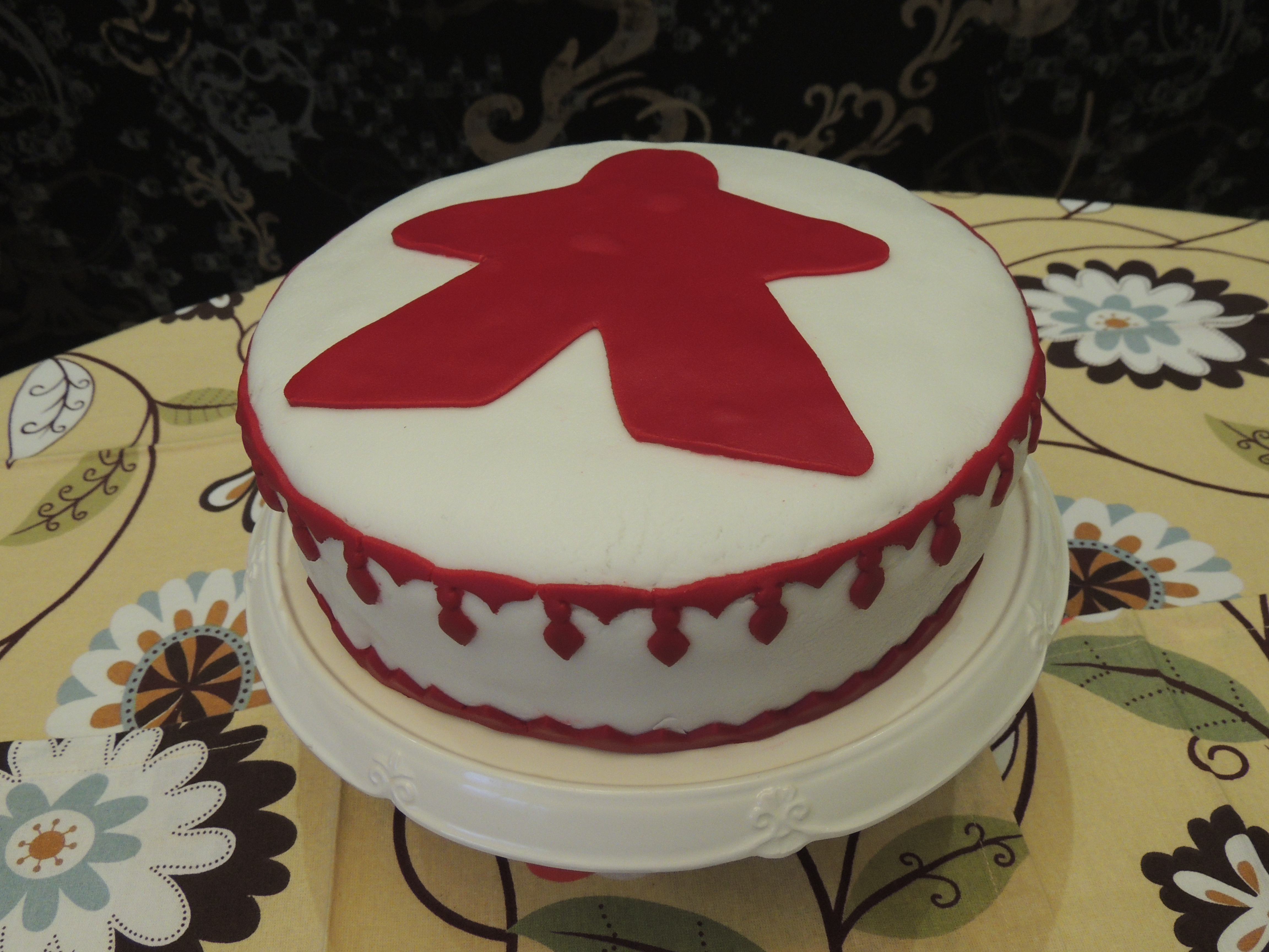 To celebrate our birthdays (mine and ZocoDaddy’s) I decided to bake a layer cake for our gaming night. Nothing fancy like the ones Jessica makes but from whom I got the idea of making a meeple themed cake. We are a group of five so I didn’t need a big cake and to make Jessica’s meeple-shaped cake I would have to bake more cakes than we would be able to consume. So I settled for a small round cake: one layer chocolate, two layers yellow, filled with dulce de leche, crumb coated with ganache and covered with a thin layer of white fondant. Mrs. Goldfish helped me with the mould I used to cut the meeple. For the yellow cake I used one of my mum’s recipes and for the chocolate cake I used Rita Lobo’s recipe. Here I must say that I didn’t like the texture of Rita’s cake. It was a bit too compact and dry, quite similar to a shop-bought cake. In my case that wasn’t much of problem because I needed sturdier cakes to bear the weight of the other layers +filling +ganache +fondant +decorations. So it worked out well.