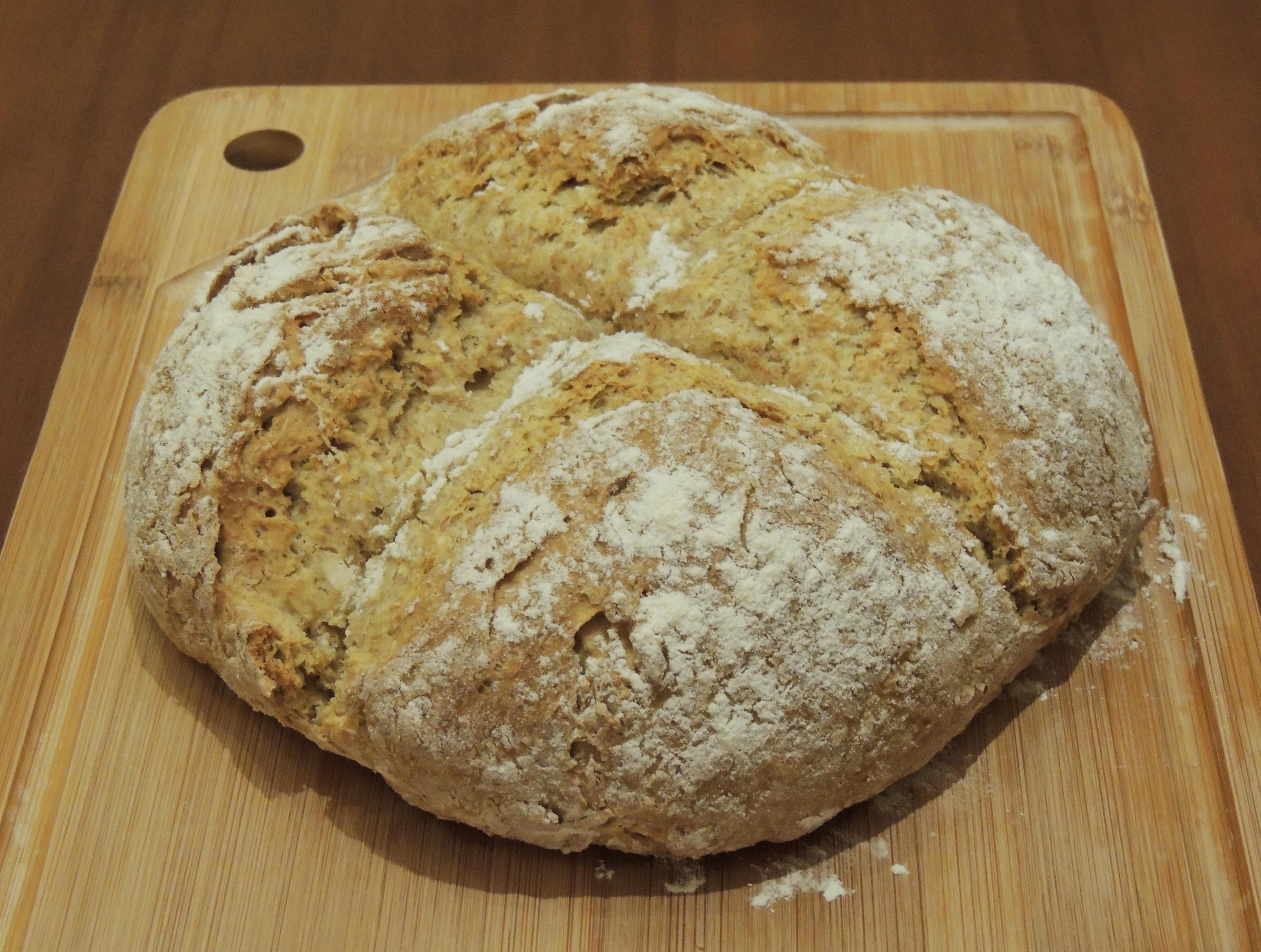 Place all dry ingredients in a bowl, make a well in the centre and add the other ingredients. Bring it together with a wooden spoon at first, and then with floured hands – no kneading, just until it comes together into a ball. Place it on a floured tray. Flour the end of a wooden spoon and mark a cross on top of the dough. Sprinkle a little flour and bake for 30-40 minutes.
